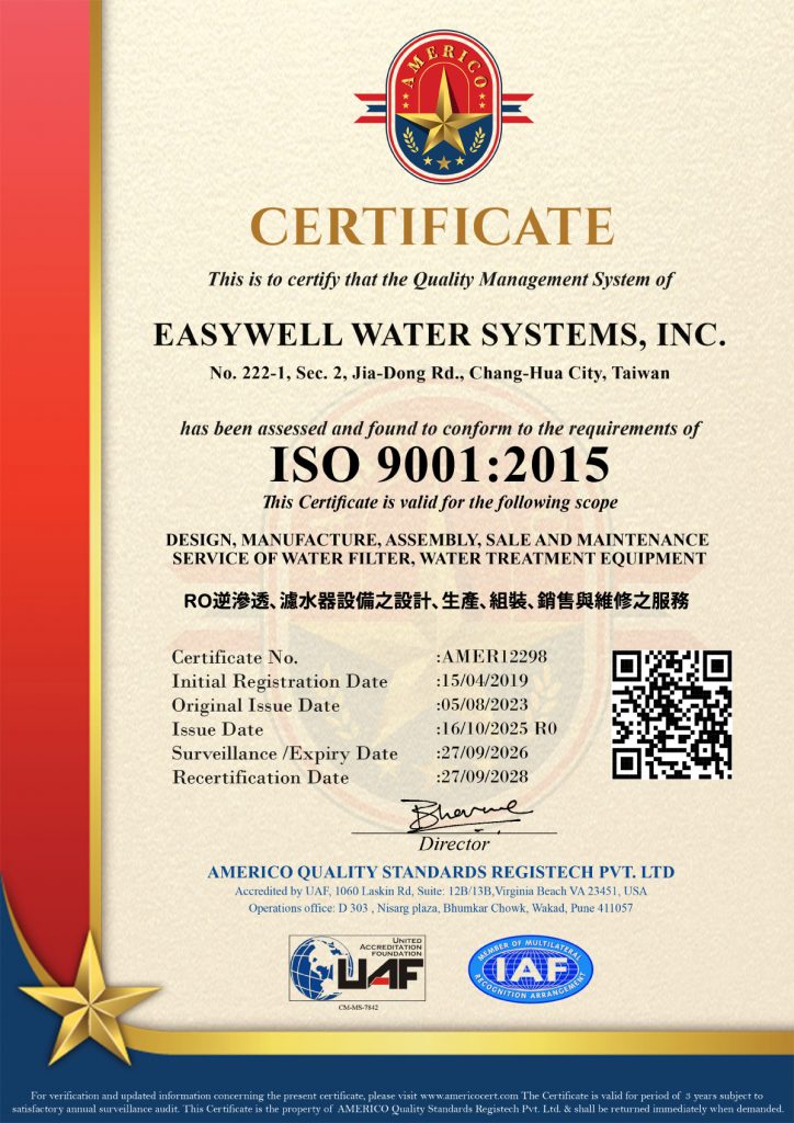 3.Product development requirements: Before a product is launched, it must undergo more rigorous tests than NSF standards, including lifespan and toxicity tests. To date (2021), we have invested 18 million NTD in building a professional quality testing centre. Testing covers filter housings, cartridges, individual parts within RO systems, such as booster pumps, four-way valves, high and low-pressure switches, storage tanks, PE pipes, gooseneck faucets, and more. Only after ensuring the quality of these components do we bring the products to market.